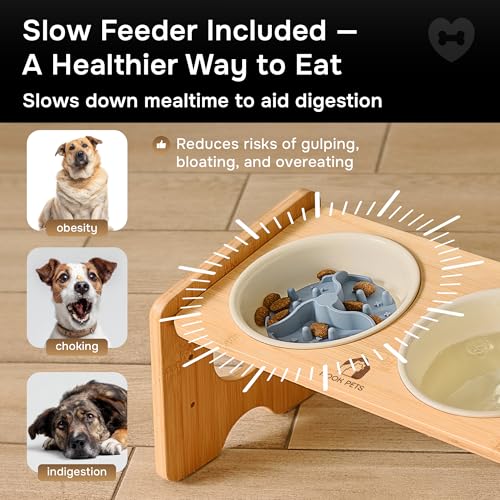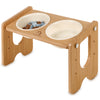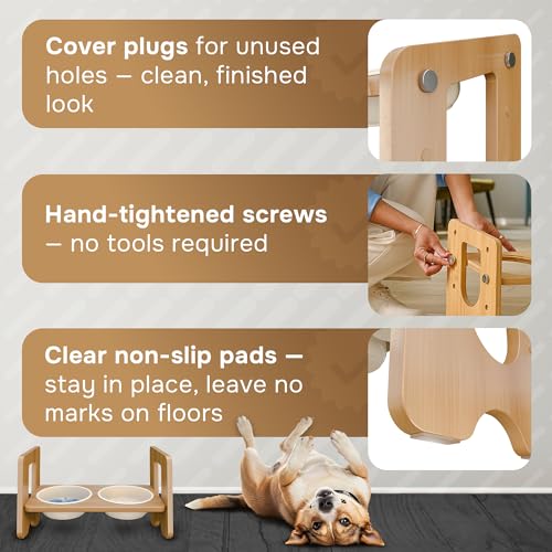 In the box: Bamboo stand, 2×22oz ceramic bowls, slow-feeder insert, hand screws.
